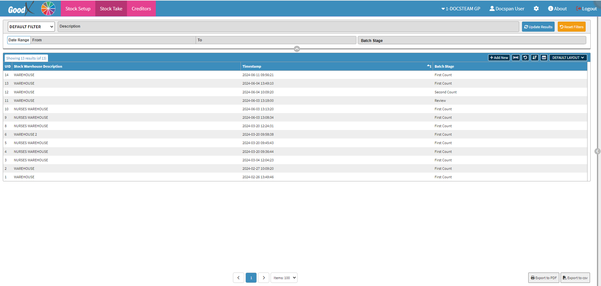 • Stock Take Timestamp: A date (yyyy-mm-dd hh:mm:ss) and time stamp of when the Stock Take was done.