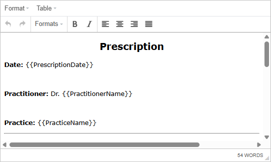 Printing Snippets also supports the use of placeholders, which automatically insert relevant details such as Patient, Practice, or Invoice information when added to a document. This functionality allows you to create consistently styled and accurately populated sections, enhancing efficiency, accuracy, and brand consistency across all Practice correspondence.