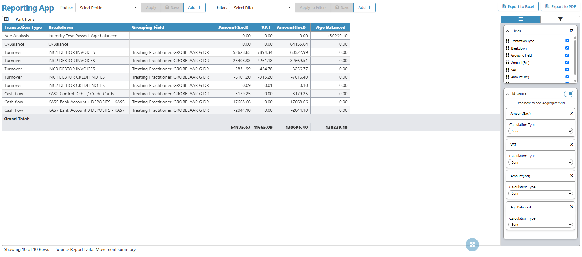 The Reporting App offers powerful tools for customising and interacting with the data beyond the limitations of the standard reports. This includes features such as advanced filtering, grouping, dynamic sorting, exporting etc.