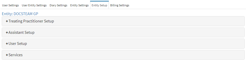 Allows you to configure the Treating Practitioners, Assistant Practitioners, System Users, and the services to which this specific Entity is subscribed. This ensures that all Users and services are correctly linked to the Entity, enabling accurate record-keeping, efficient scheduling, and seamless billing within the system.