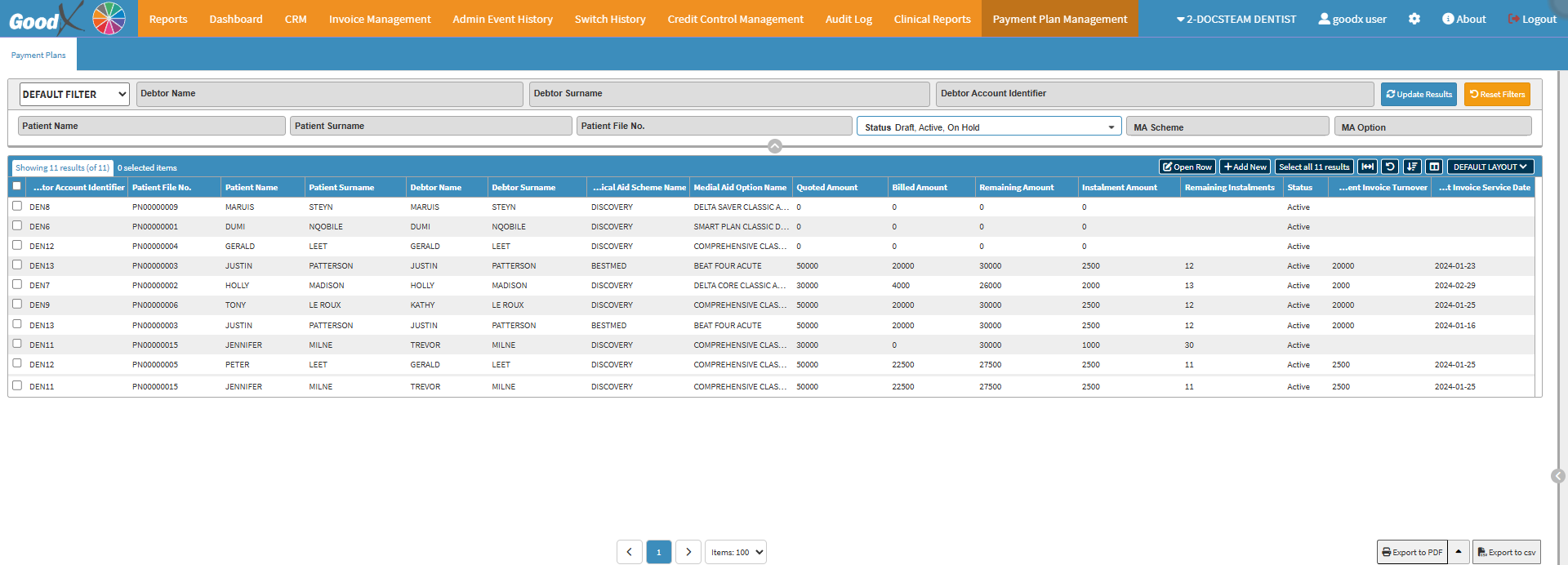 Once a Payment Plan is saved, all captured financial details are securely stored and displayed on the Payment Plan Management screen. This allows the Practice to retain an accurate record of the arrangement while providing flexibility to review, track, and update the plan as needed. By double-clicking on a saved payment plan, the Add/Edit Payment Plan screen will reopen, allowing you to make changes if required.