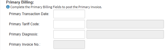 The Primary Billing section captures and records the essential details of a Patient’s initial Billing Transaction, including the Transaction Date, Tariff Code, Diagnosis, and Invoice Number, ensuring accurate, auditable, and streamlined financial processing.