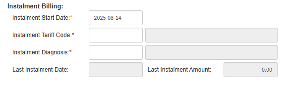 - Instalment Diagnosis: Start typing at least three characters to select the ICD-10 Diagnosis Code for the Instalment. Only one Code can be used, and this is a required field.