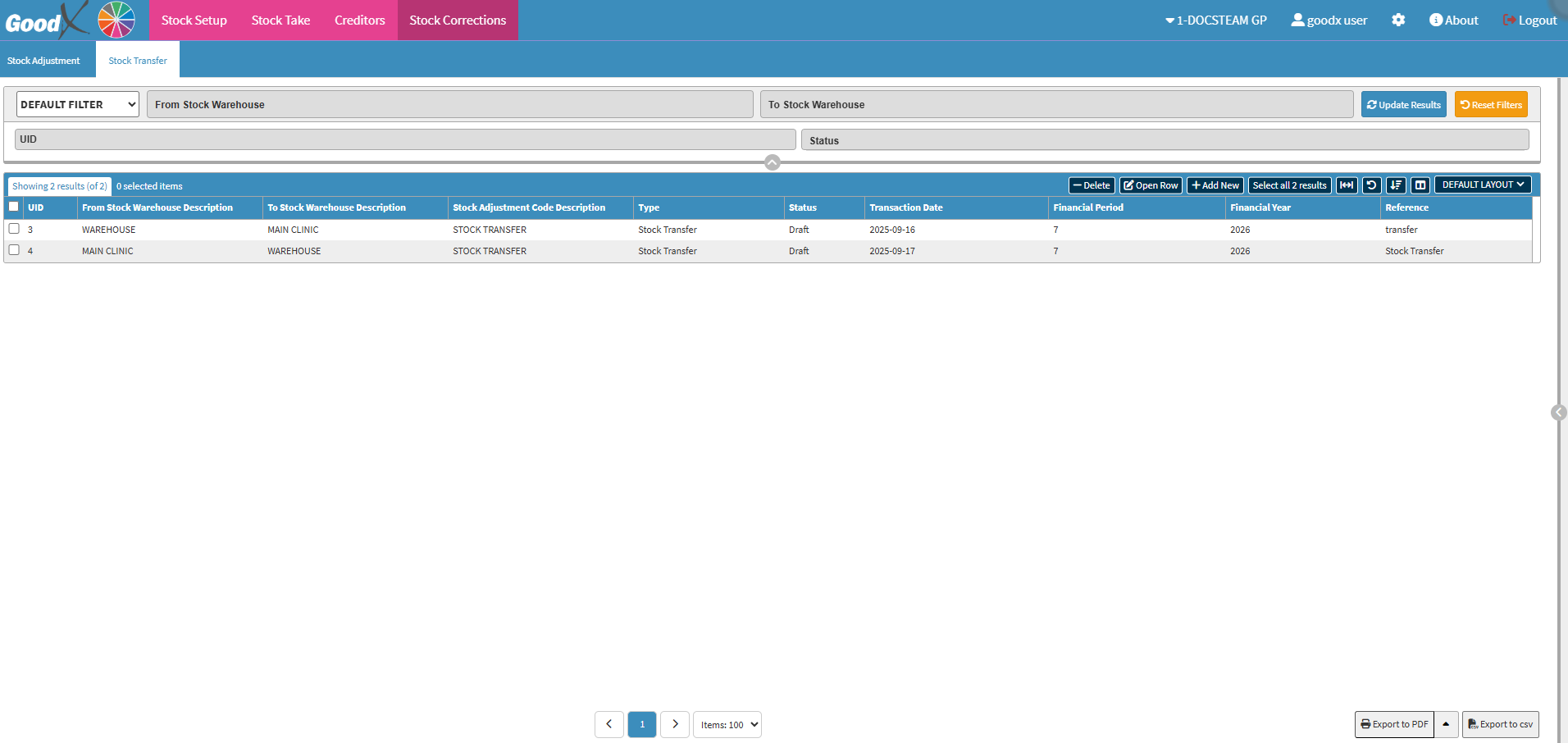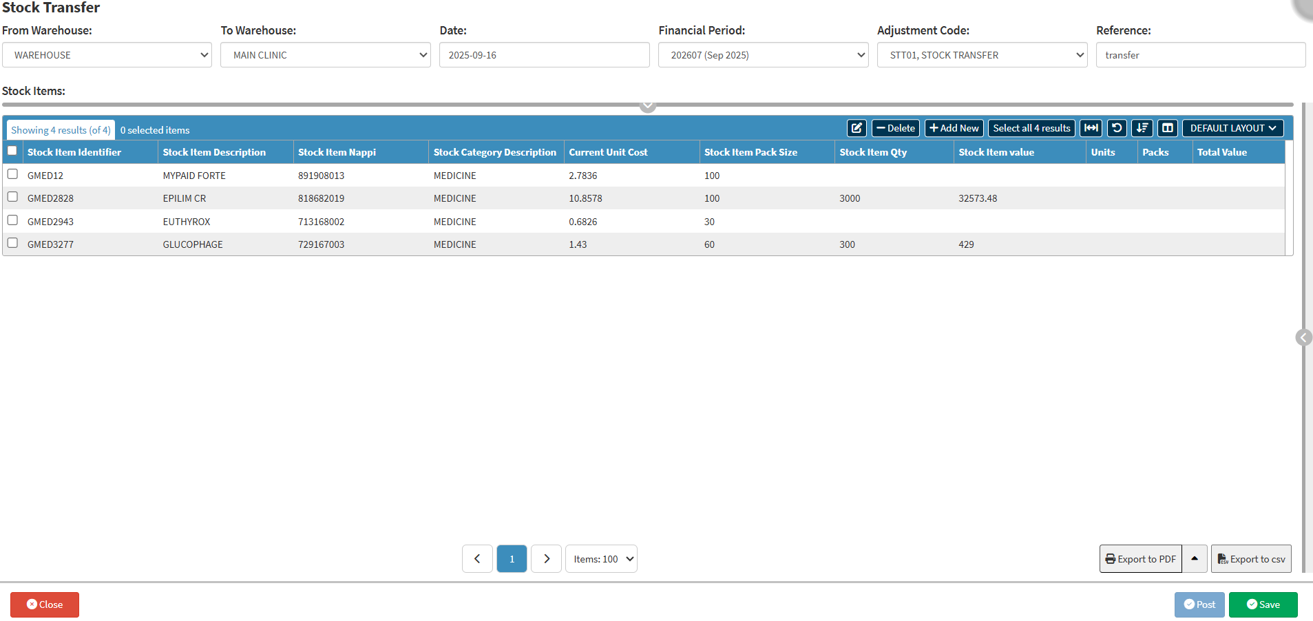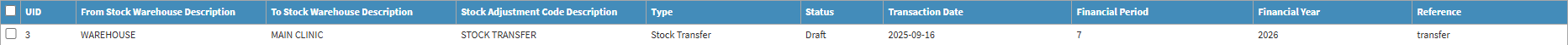 💡Please Note: Transfers can only happen if your Practice has a multi-warehouse setup, where Stock is moved from the main distribution Warehouse to smaller warehouses where the Stock is used.