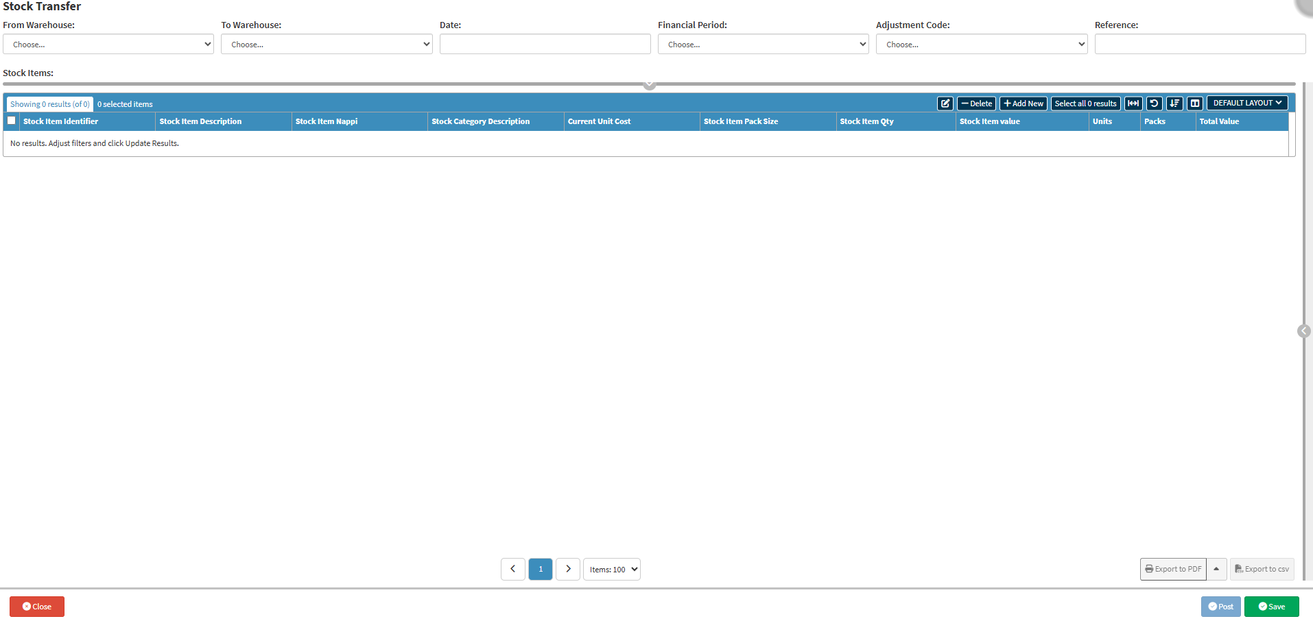 Several additional Options are available for the Columns. These additional Options are to help the User adjust the List, refine the Search and give more specific results.- Click on the Delete button to delete the selected stock transfer.