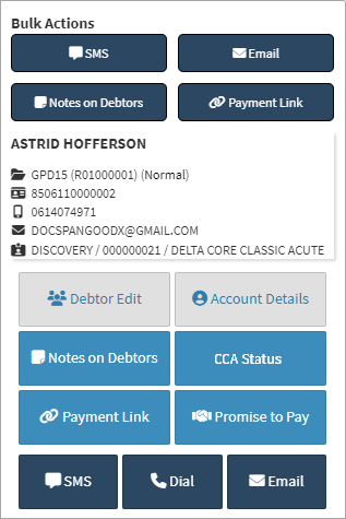Communication buttons are also located on the Posted Invoices sidebar in order to make communication easier to the Debtor, either by sending an SMS or Email or Phoning the Debtor directly.