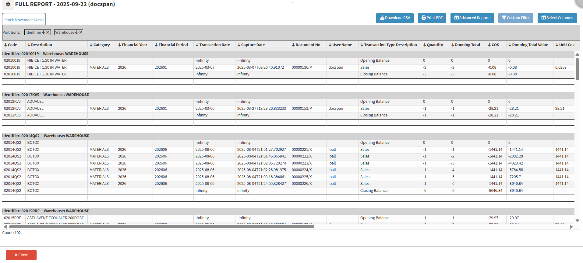 The Stock Movement Detail Report gives the Practice a complete and transparent audit trail of every stock item’s activity within a selected time period. This Report not only shows essential details such as opening and closing balances, unit prices, transaction types, running totals, and supplier information, but also provides a clear breakdown per stock item and per warehouse.