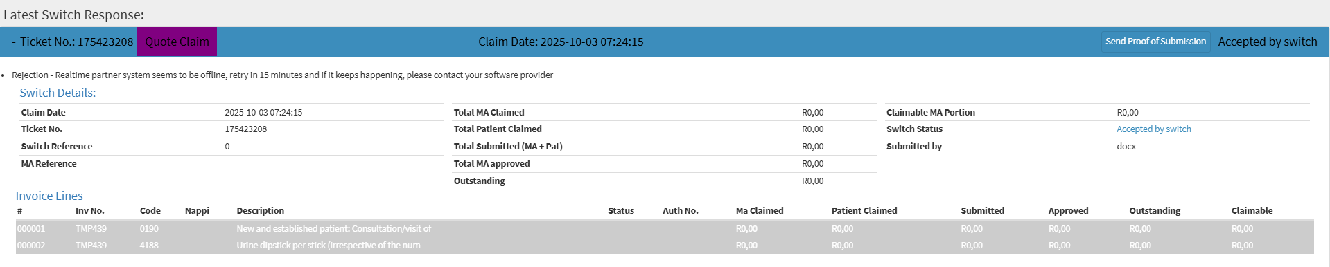 - Submitted: The total amount submitted (Medical Aid and/or Patient) for this line item.