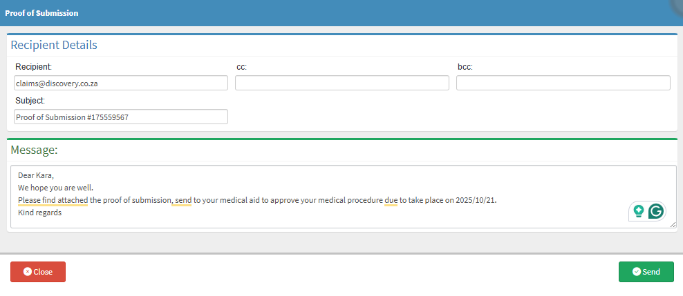 ?Please Note: The Medical Aid and Debtor's email will be filled in automatically when the Proof Of Submission screen opens.