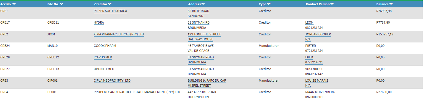 The Creditors list displays key details such as Account and File Numbers, Creditor Name, Address, Contact Person, and Balance, allowing efficient management and tracking of all supplier information within the Practice.