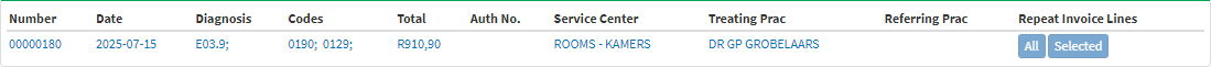 💡Please Note: The Invoice History will show the last 5 Invoices that have been posted to the Patient's account, to prevent duplicate Invoices. An error message will appear if there are two invoices on the same date.