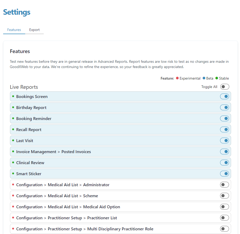 Click on the slider next to the relevant feature to enable or disable live reporting for that specific feature.