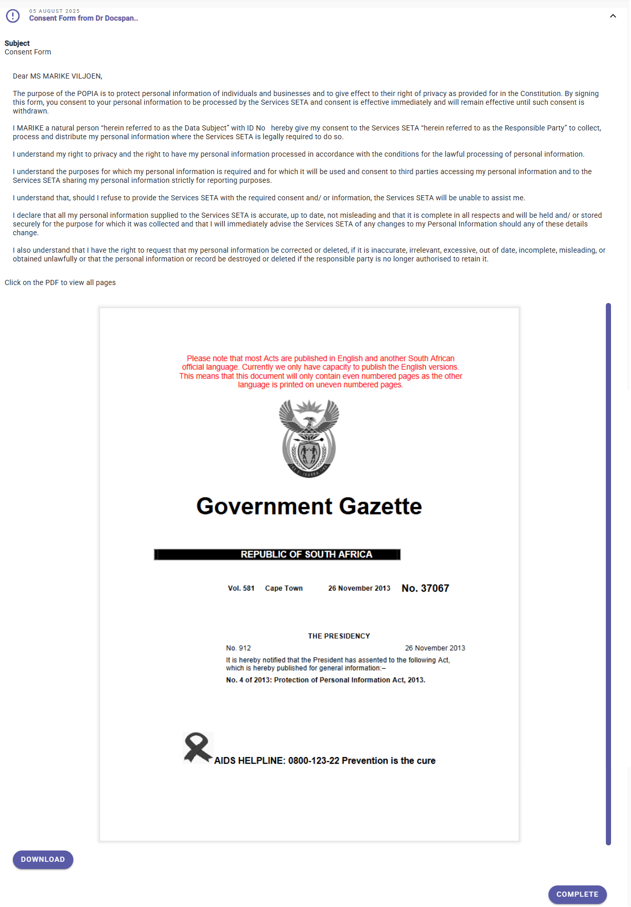 The information of the Signee will be displayed with a date and time stamp to advise by whom and when the Consent Form was signed.