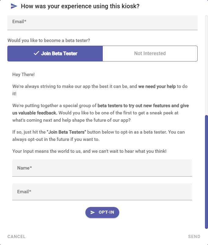 ? Please Note: If you have selected the Join Beta Tester option, the screen will expand, giving you the option to enter your Name and Email. These are additional mandatory fields and must be completed before you can submit the form.