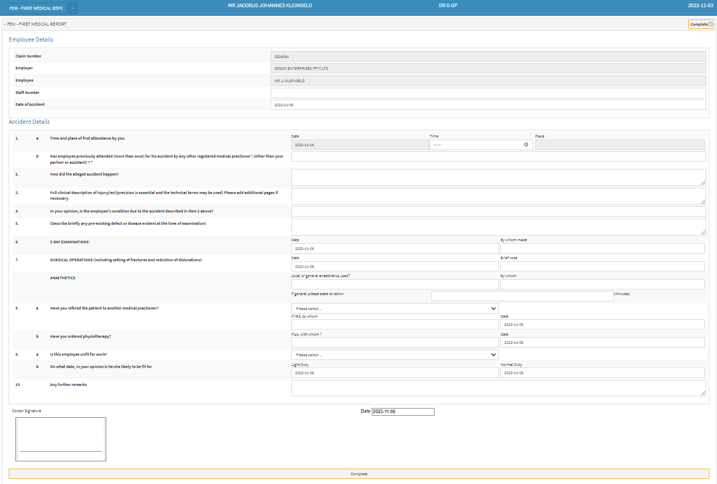 The following information will appear in the Employee section: This is all the personal employee information relating to the Patient that has been assessed by the Practitioner.