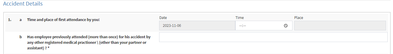 b. Has employee previously attended (more than once) for his accident by any other registered medical practitioner\(other than your partner or assistant)?*: Complete the relevant information required in the Text field.