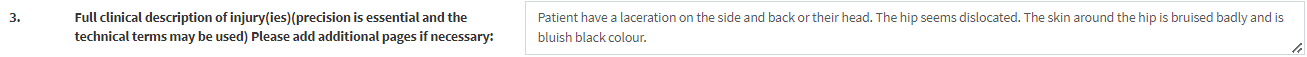 3. Full clinical description of injury(ies)(precision is essential and the technical terms may be used) Please add additional pages if necessary: Complete the information of the Patient's injuries in the Text box/field.
