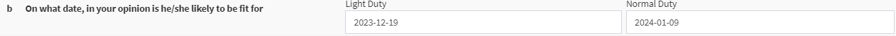 b. On what date, in your opinion is he/she likely to be fit for: The Practitioner needs to advise if the Patient can return to Light Duty or Normal Duty.