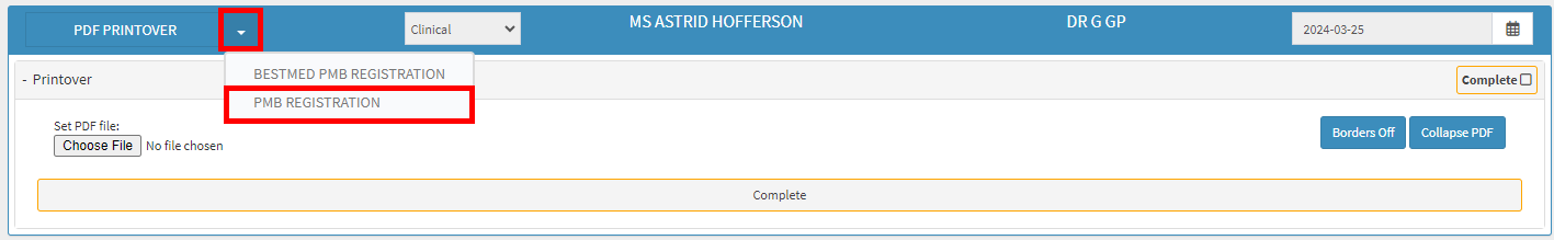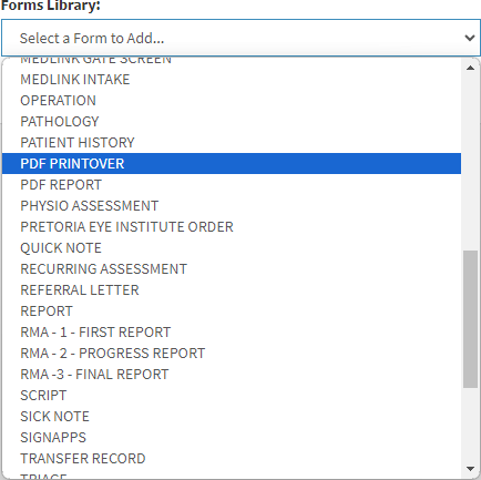Click on theForms Library drop-down menu on the Clinical sidebarand Select the PDF Printover.