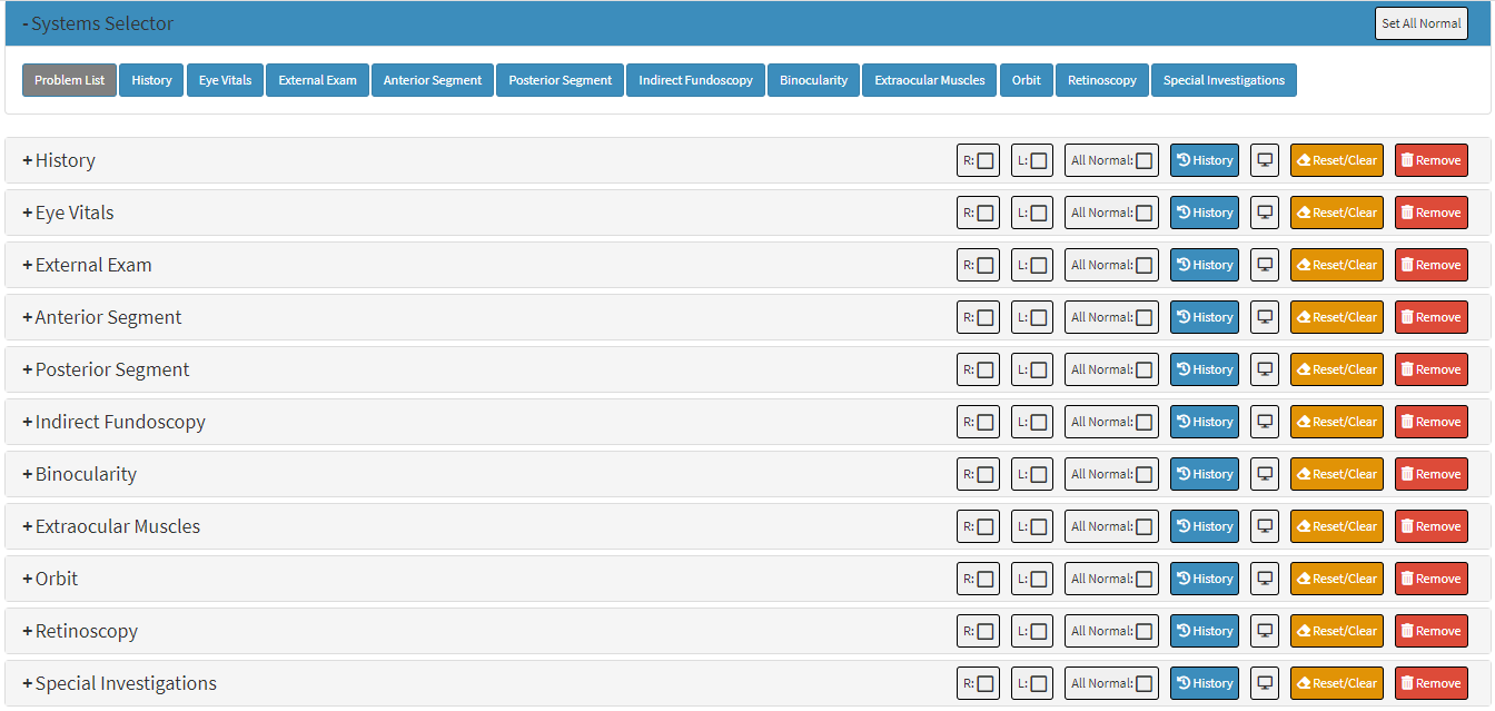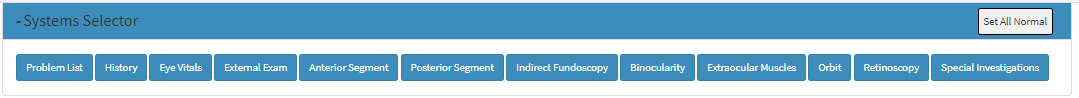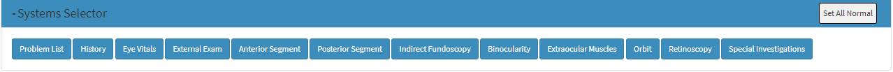 A System Selector allows the Practitioner to choose and select which panels and or sections will appear on a form. Practitioners can select only the panel that they will require, and all the other panels will be hidden. Panels can easily be made visible again if the need arises. The System Selector is made up of buttons that can be selected and deselected in order to show only the panels on the form which the Practitioner would like to use.