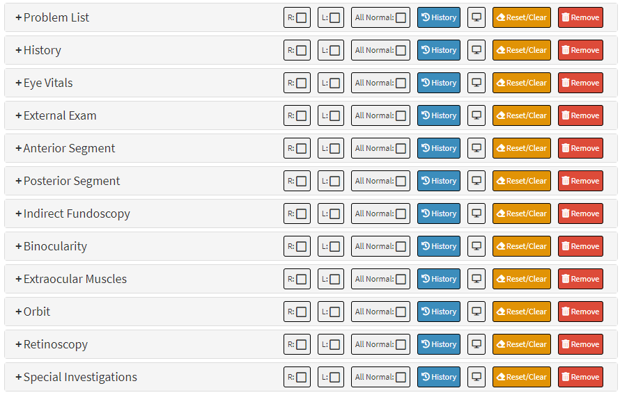 Please Note: All panels within the History, Examination and Review of Systems section can be hidden, by clicking on the corresponding button as explained above.