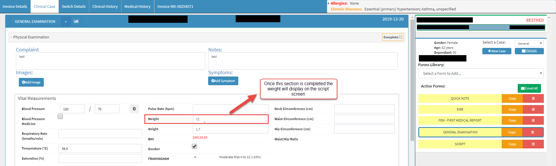 TAKE NOTE: In order to see the patient weight, Dr must first complete the weight field in the General Examination.