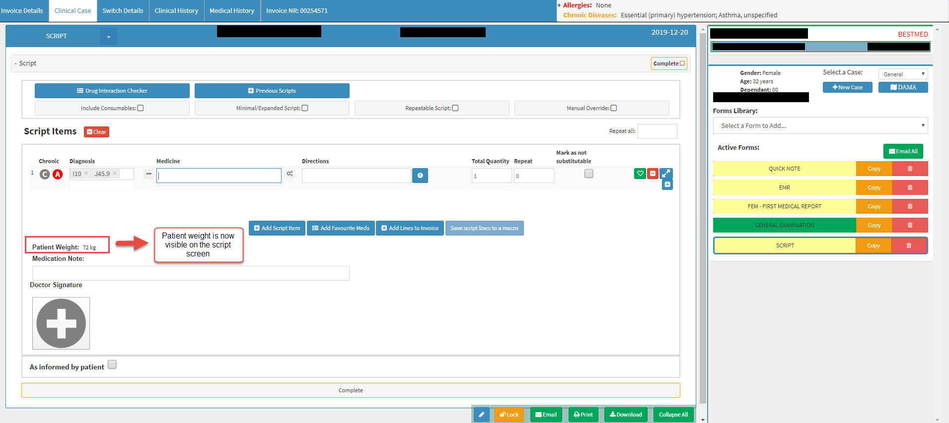 • On the script above Medication note, the Dr can now see the Patient weight. This will let the Dr prescribe medication more accurately.