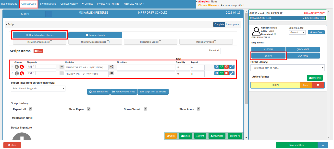 - Complete the script items part. Enter the Diagnosis and Medication that the Doctor will prescribe.