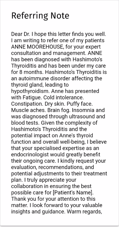 Referring Note: A written communication from one Practitioner to another, typically from a General Practitioner to a Specialist, recommending a Patient for further evaluation, diagnosis, or treatment. The referral note summarises the reason for the referral and provides relevant medical history, test results, and any other relevant information about the Patient's condition.