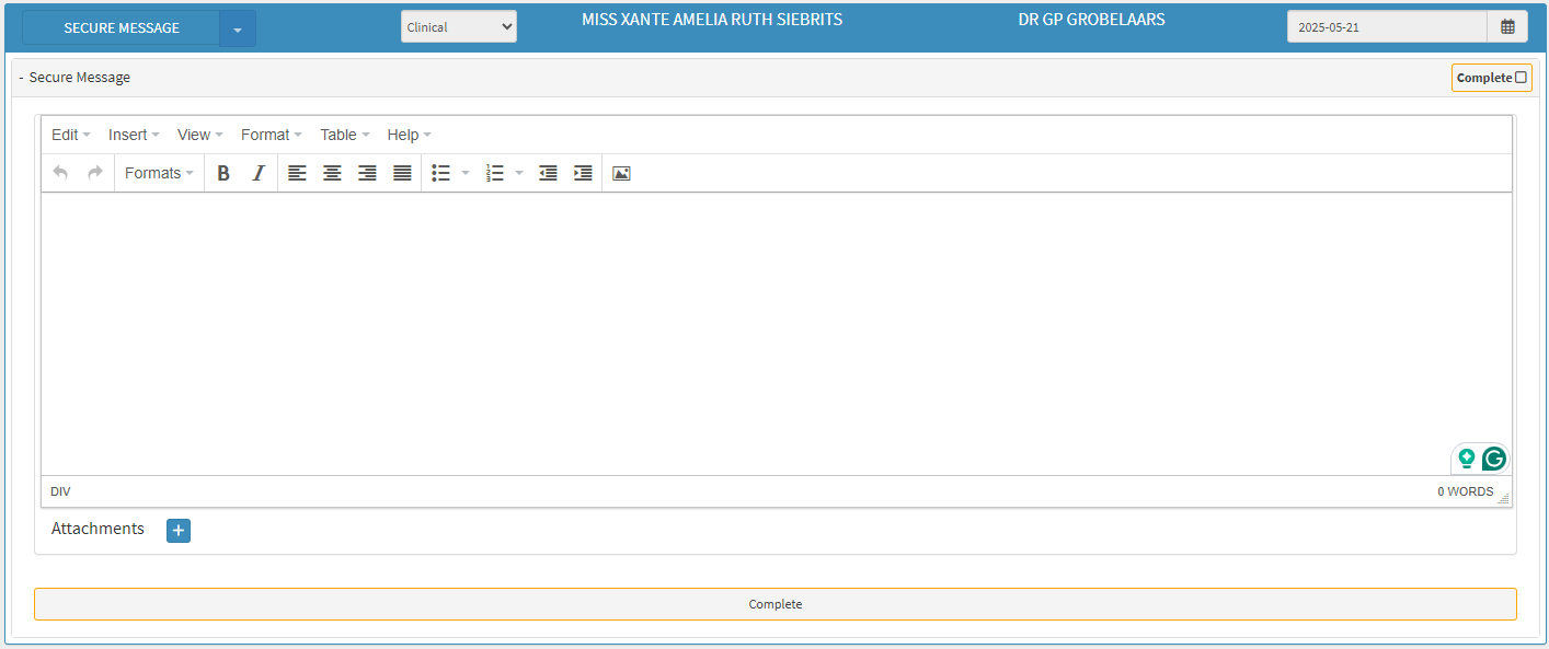 - Click on the Complete button to save any changes once all of the necessary information has been completed on the Secure Message.