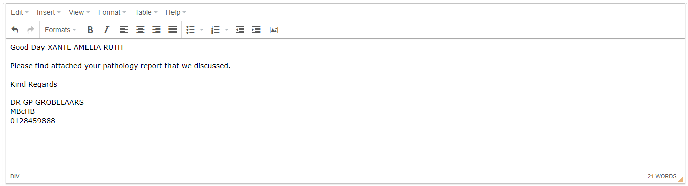 - Click on the Body section to enter the message/information that you would like to share with the Patient.