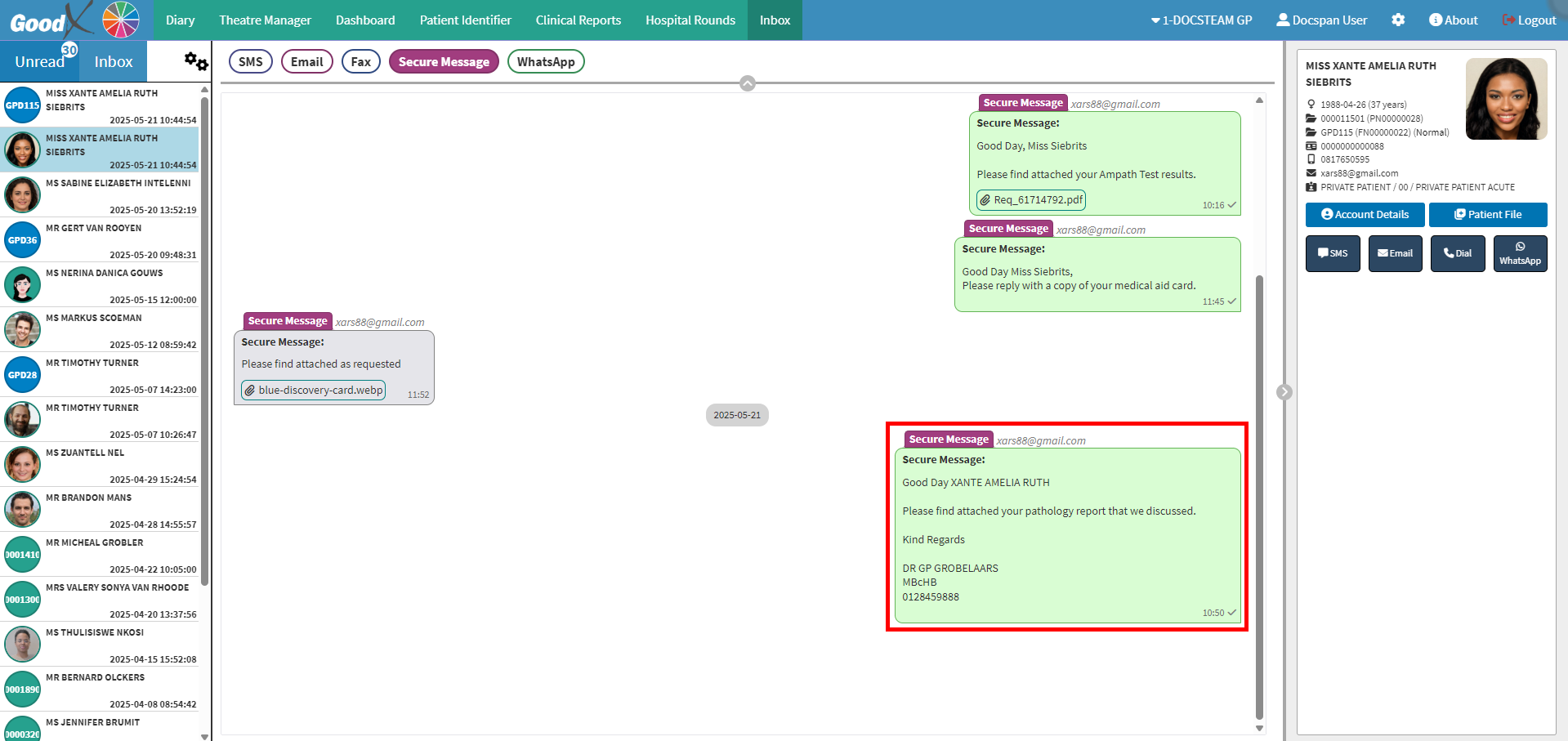 Sending a Secure Message allows you to communicate with your Patient through an encrypted and protected channel, ensuring that only the intended recipient can access and read the message. This safeguards sensitive or confidential information, such as Patient data, financial records, and other private content, from being intercepted or misused. Secure Messaging also supports compliance with data protection laws like POPIA and GDPR, while significantly reducing the risk of data breaches.