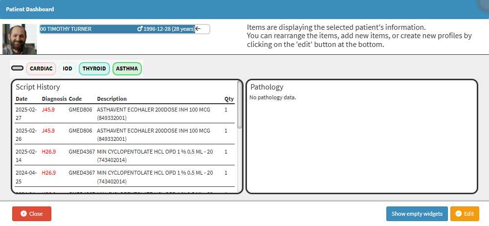 An overview of the Patient's details and their past Clinical Data, starting from their initial visit to the Practice.- Click on the Patient Dashboard button.