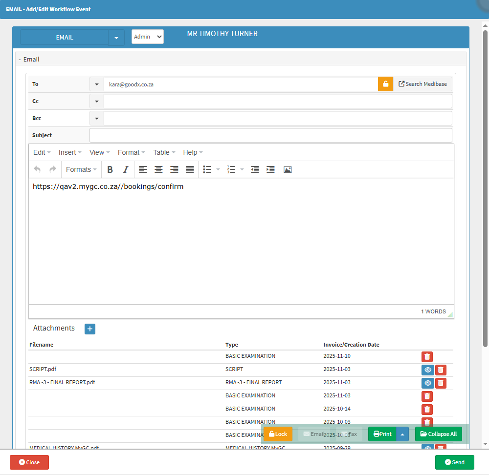 - The Email - Add/Edit Workflow Event screen will open with all the visible Clinical Events as Attachments.