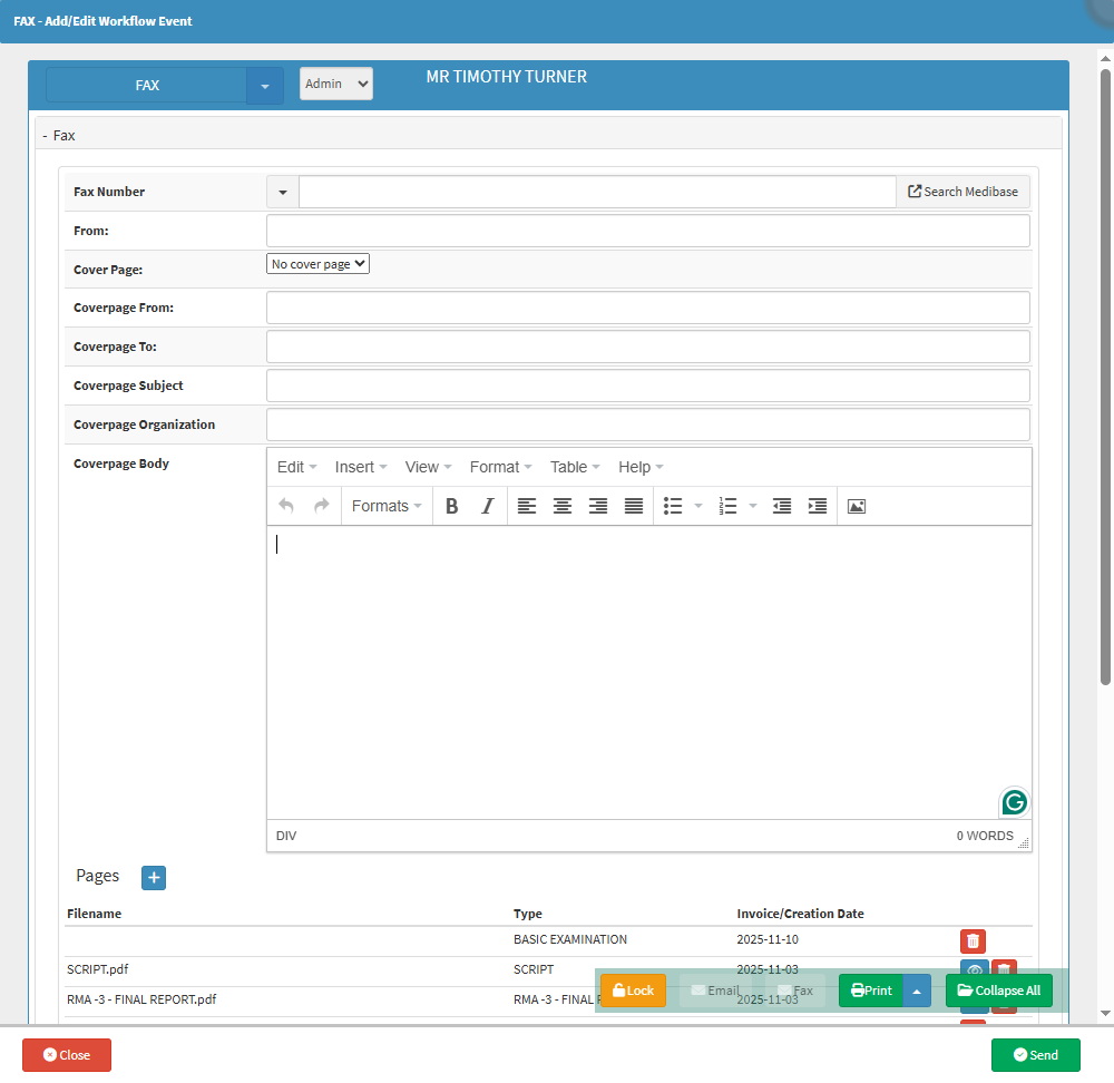 - The Fax - Add/Edit Workflow Event screen will open with all the visible Clinical Events as Pages.