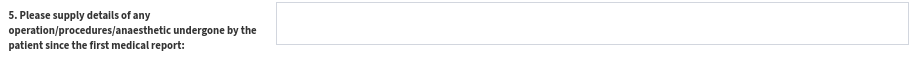 - 5. Please supply details of any operation/procedures/anaesthetic undergone by the patient since the first medical report: All details regarding any operations, procedures, and anaesthetics that the patient underwent since the initial IOD medical assessment as part of treatment to stabilise the injuries sustained during the IOD incident. This is a free text field that will need to be filled in.