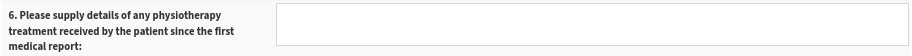 - 6. Please supply details of any physiotherapy treatment received by the patient since the first medical report: Has the patient been to see a physiotherapist since the initial medical assessment as part of treatment to stabilise the injuries sustained during the IOD incident. This is a free text field that will need to be filled in.