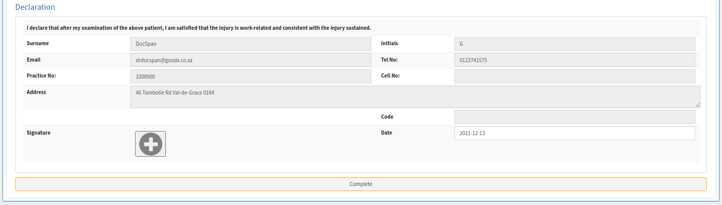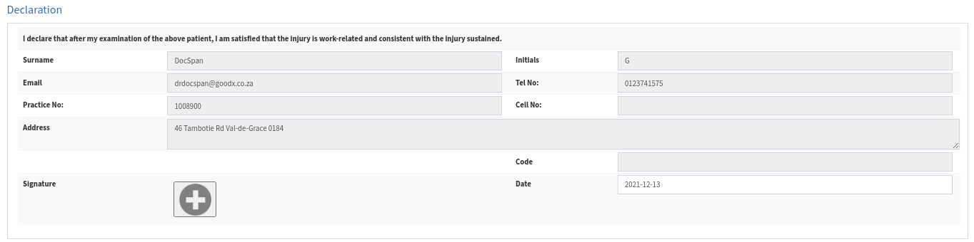- The following information will appear in the declaration section, this is all the personal information relating to the Practitioner that assessed the patient: