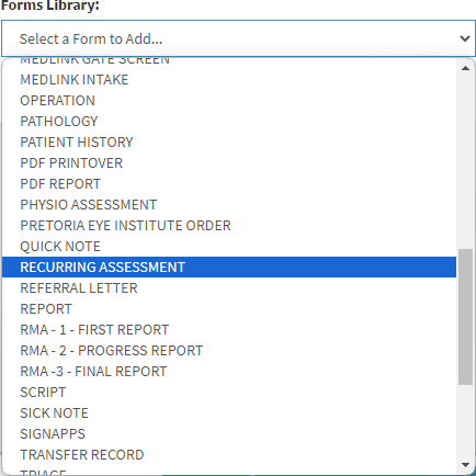 The Recurring Assessment form simplifies the documentation of examinations that occur at regular intervals or periodically over time. This feature supports the ongoing monitoring of changes, progress, or trends, aiding in diagnosis, and the development of treatment plans.