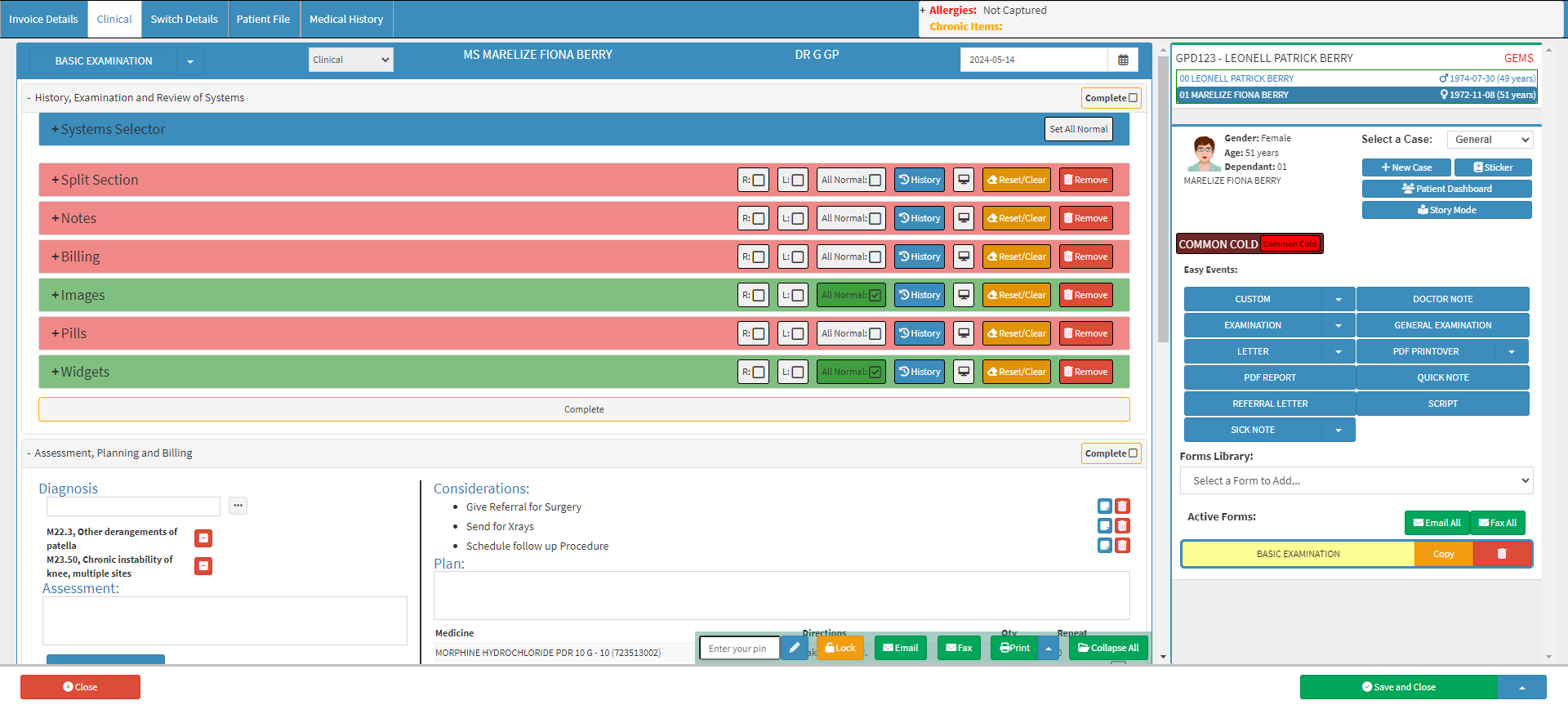 Please Note: For the purpose of this user manual, the form used has been customised to optimise comprehension of how the Assessment, Planning and Billing panel of the Examination form can work.