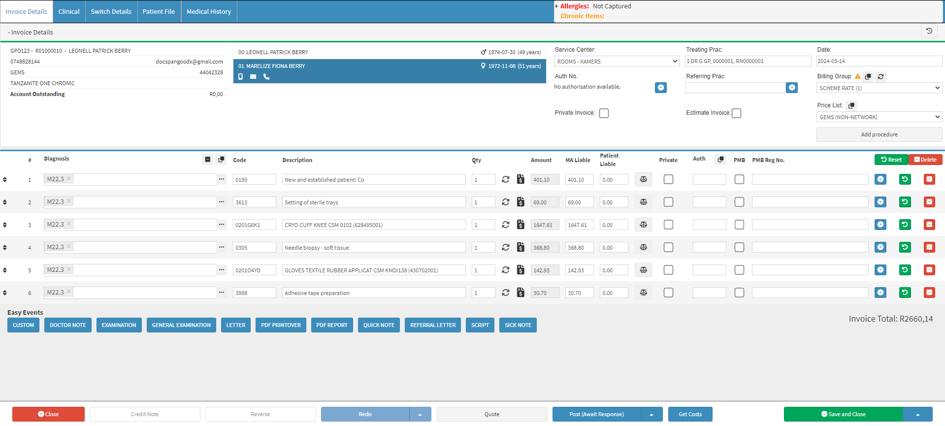 Billing: During the examination, Billing Codes can automatically be added as the tests are performed to ensure accurate and efficient Billing, as each Procedure and test associated with a specific Billing Code can then be directly added to an Invoice for fast billing.