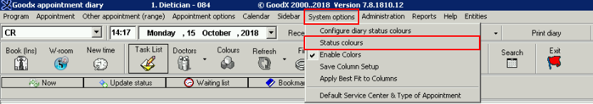 - On the Diary screen, on the Taskbar click on System Options >> Status Colours.