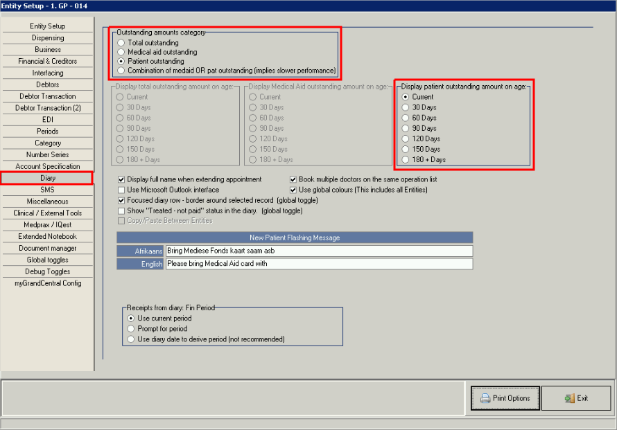 - Outstanding amounts Category: You can select what outstanding amounts need to reflect on the Diary when a Debtor / Patient is booked.