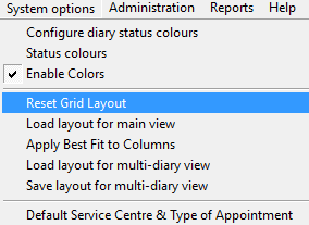 When the diary columns have been resized or moved the reset grid layout can be used to reset the order and size of the columns back to the original order or size.