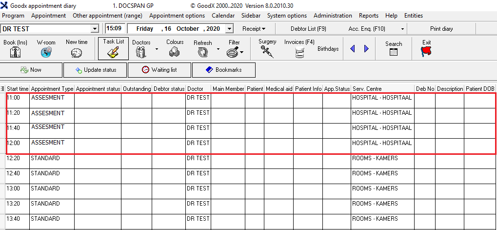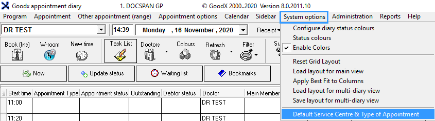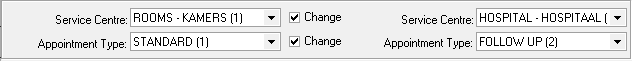 All the appointments are linked to a Service centre and an Appointment type. If the Practice only has one Service centre or Appointment type, the Service centre and/or the Appointment type can default on all the bookings. This will save time because the Service centre and appointment type do not have to be chosen for each booking. When there are more than one, the default can be set to the one that is used the most and can be changed on the single bookings where necessary. This can always be changed after the default is set.