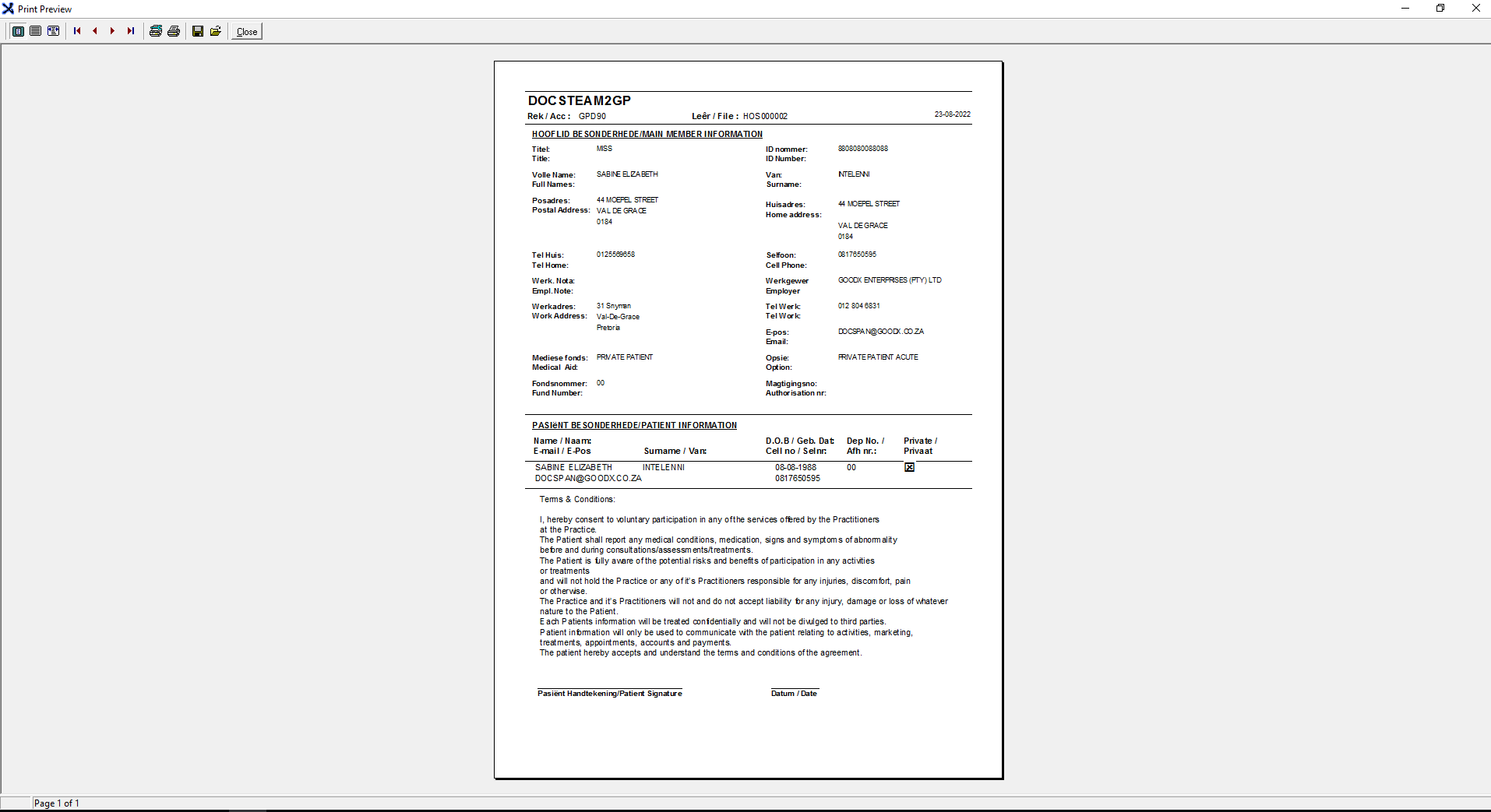 Allows the user to print out a hard copy of the File Cover Sheet in order for the Patient to check and confirm if the information that is on the system is correct, and to agree to the Terms and Conditions of the Practice.