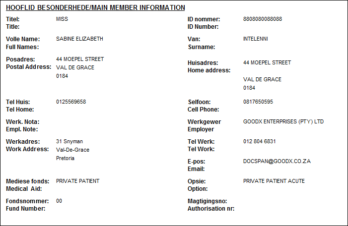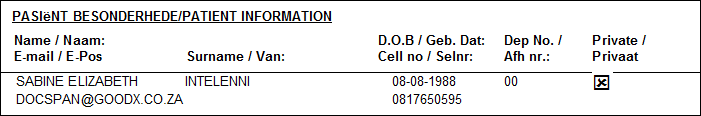 The following information will be displayed in the Pasiënt Besonderhede/Patient Informationsection:
