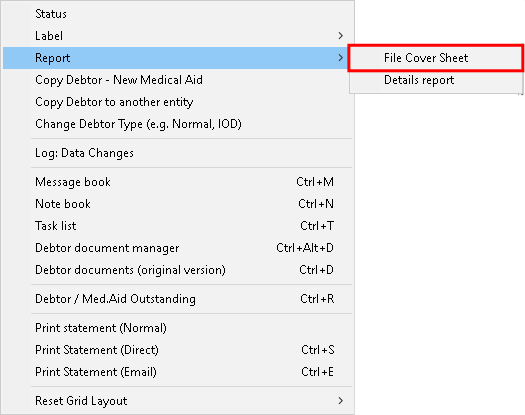 The File Cover Sheet is an A4 document with the demographic information of the Main Member/Debtor and Patient. The user is able to print out a hard copy of the information that is on the electronic file. The Practice can add the terms and conditions or a disclaimer to the cover sheet, which allows the Practice to communicate important information to the Main Member/Debtor. The Practice can ask the Main Member/Debtor to verify that the information on the system is correct and to agree to the Terms and Conditions by means of signing the Debtor Cover Sheet.