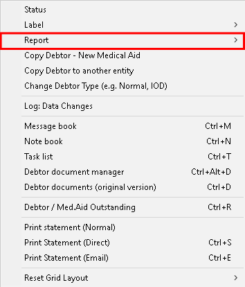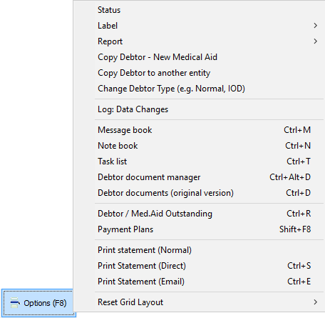 Click on the Options (F8) button at the bottom of the screen or press the F8 key on the keyboard for more Debtor options.