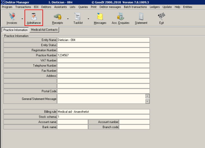 - If Med Debs screen is open, click on the "Admittance" button to access the Debtors
